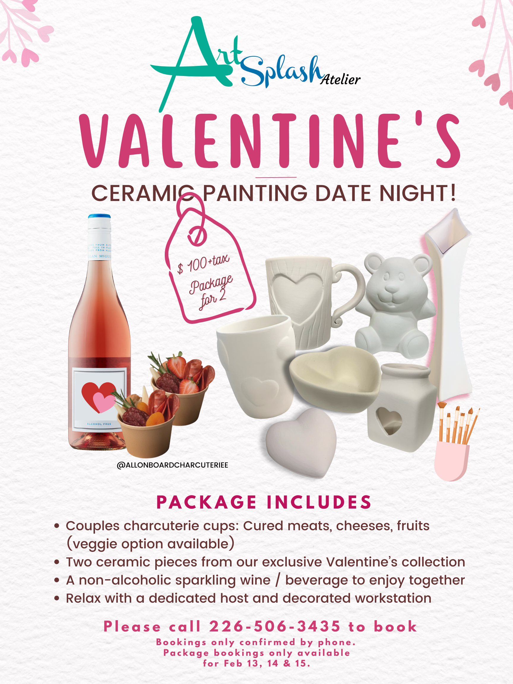 We’ve got you covered with our Ceramic Painting Package, paint love-themed pottery together, $100 + tax.